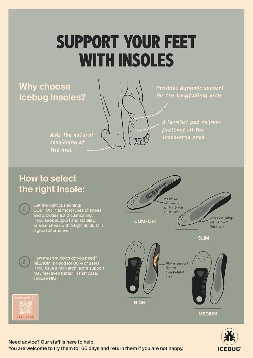 Step into all-day comfort with the Icebug Comfort Insoles Wool, designed for high arch support and superior cushioning. Whether you’re walking, standing, or running errands, these insoles align your feet naturally, reduce strain, and provide long-lasting comfort. – High Arch Support (36.5mm Medial Arch Height) – Designed for individuals with high arches, these insoles provide the extra support needed to reduce foot fatigue, improve posture, and enhance stability. The 36.5mm arch height helps distribute weight evenly, minimizing stress on your feet, ankles, and knees. – Soft 5mm Cushioning – Adds comfort and absorbs impact for a smoother walking experience. – Temperature-Regulating Wool – Naturally warms your feet in cold weather and cools them in warmer temperatures, ensuring year-round comfort. – Dynamic Comfort & Foot Alignment – Helps prevent discomfort and supports healthy foot movement, reducing pressure on sensitive areas. – Fits Most Shoes – Ideal for sneakers, boots, and everyday footwear. If you have high arches and need extra support, the Icebug Comfort Insoles Wool will keep your feet comfortable, aligned, and supported every step of the way.